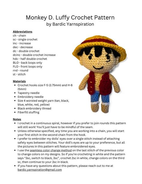 I am selling the pattern on etsy so please be sure to check it out if you'd like a downloadable pdf copy of the pa. The finished monkey d luffy will be about 7 inches (17 cm) this pattern is included :monkey d luffy head, body, ears instructions , removable outfit with more than 50 photos of illustrations. I made a mini version of luffy amigurumi complete with his straw hat.