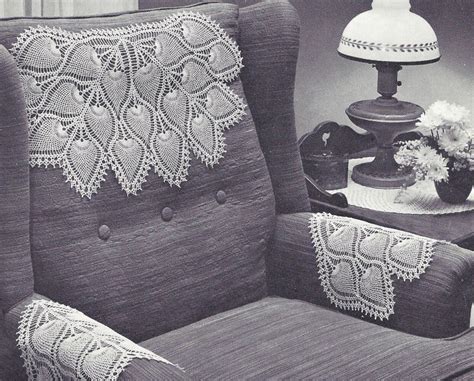 Each arm piece 10½ x 14½ inches. * ch 6, skip 9 ch, in next ch make 2 dc, ch 2 and 2 dc (another shell). Dover needlework series, pineapple crochet designs.