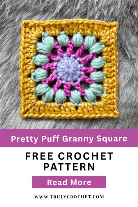 Search patterns with these attributes. The puff stitch adds a beautiful texture to this design, making it a great option for those who are looking for a unique twist on a traditional granny square.
